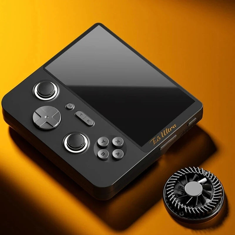 La GameMT E5 Ultra es una consola portátil con procesador UNISOC T620, pantalla IPS táctil de 5 pulgadas 1280x720, 6 GB de RAM, 128 GB de almacenamiento interno y una batería de 5,000 mAh. Incluye joysticks de efecto Hall, ventilador activo para refrigeración, y es capaz de emular juegos hasta la PlayStation 2 y PSP.